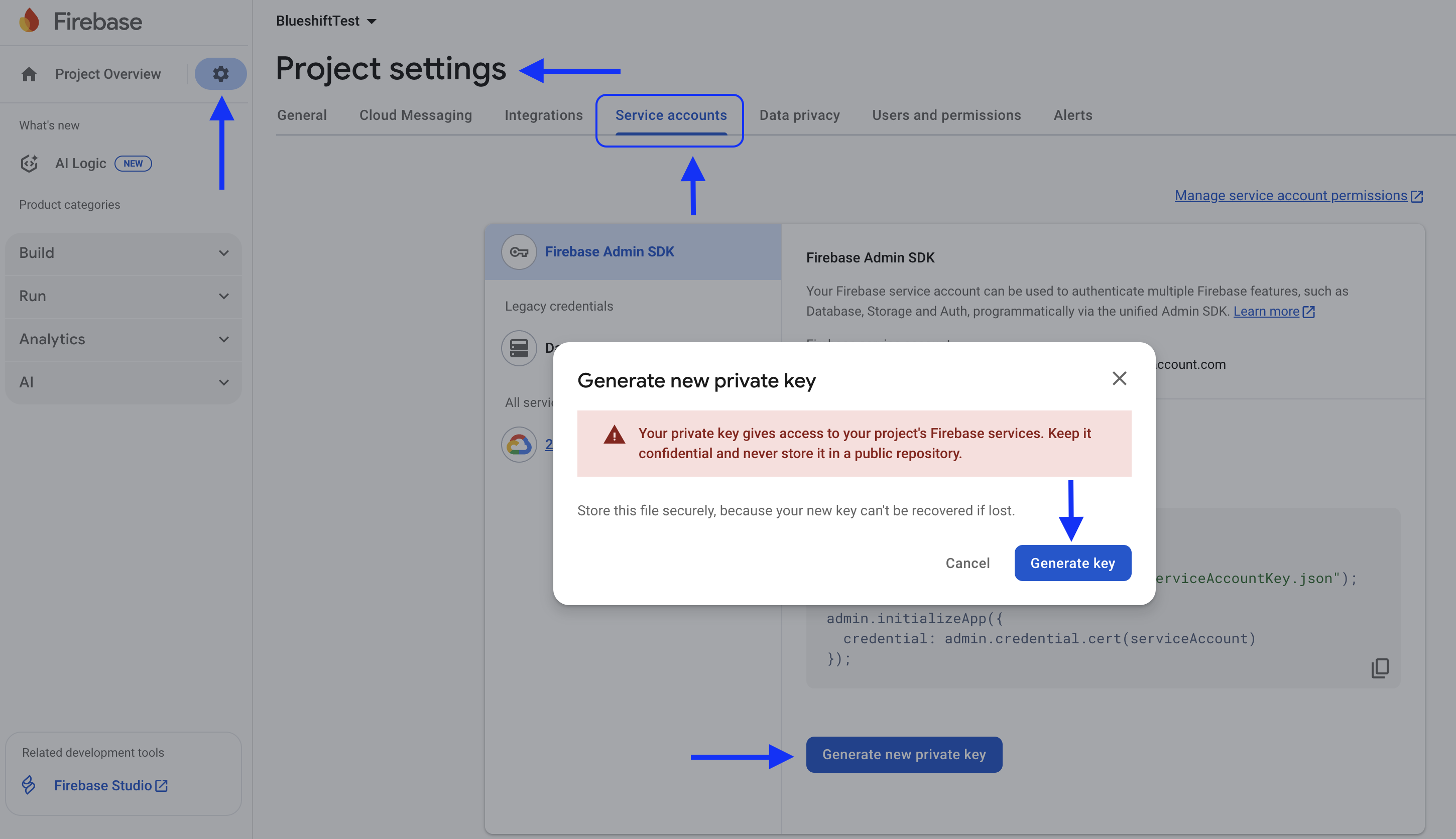- The JSON key file will download to your computer. Store it securely and do not share it publicly. You’ll need this file when setting up your push channel in Blueshift.