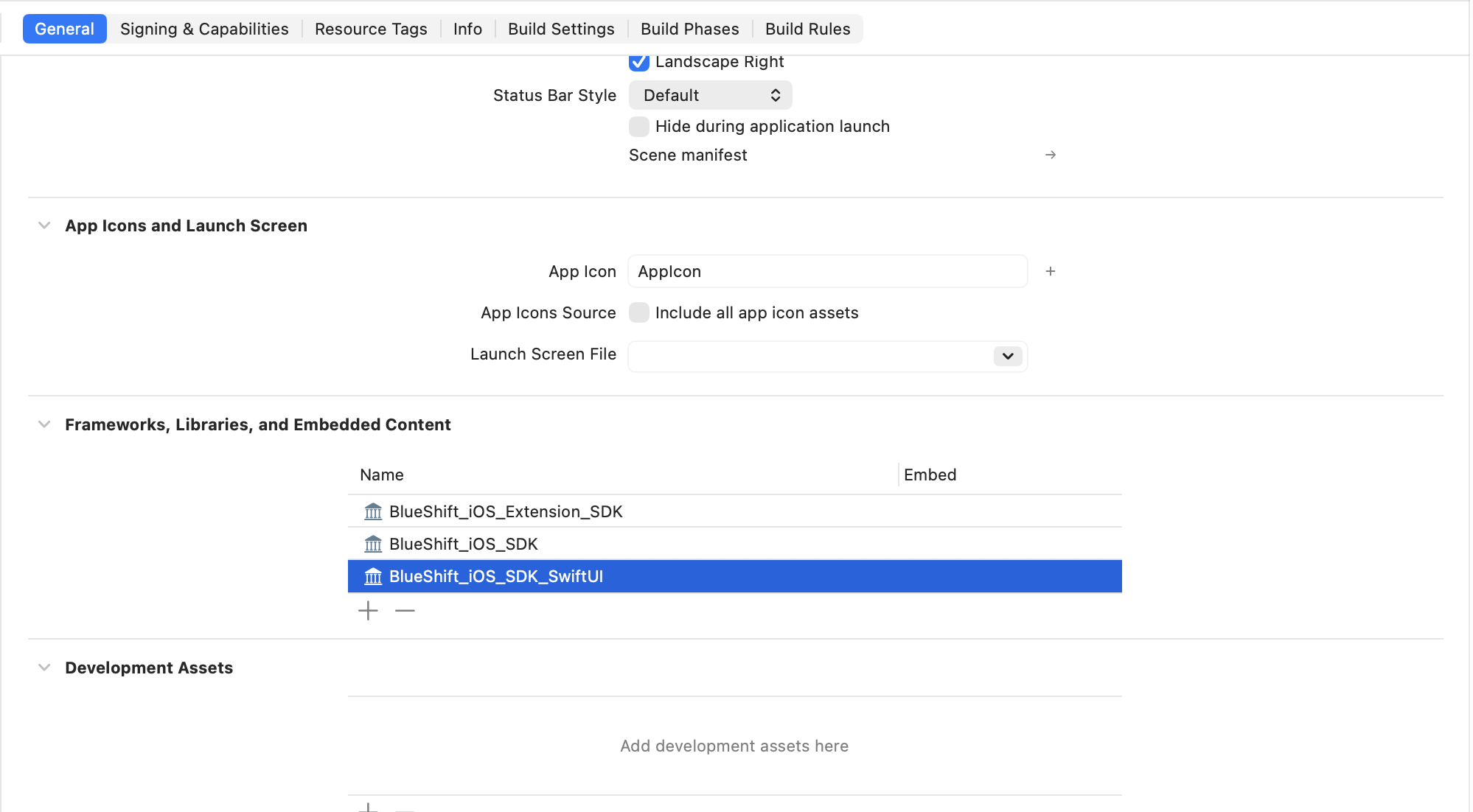 BlueShift-iOS-SDKis updated to version2.7.0or higher. - Go to Target → Frameworks, Libraries, and Embedded Content and select BlueShift_iOS_SDK_SwiftUI.