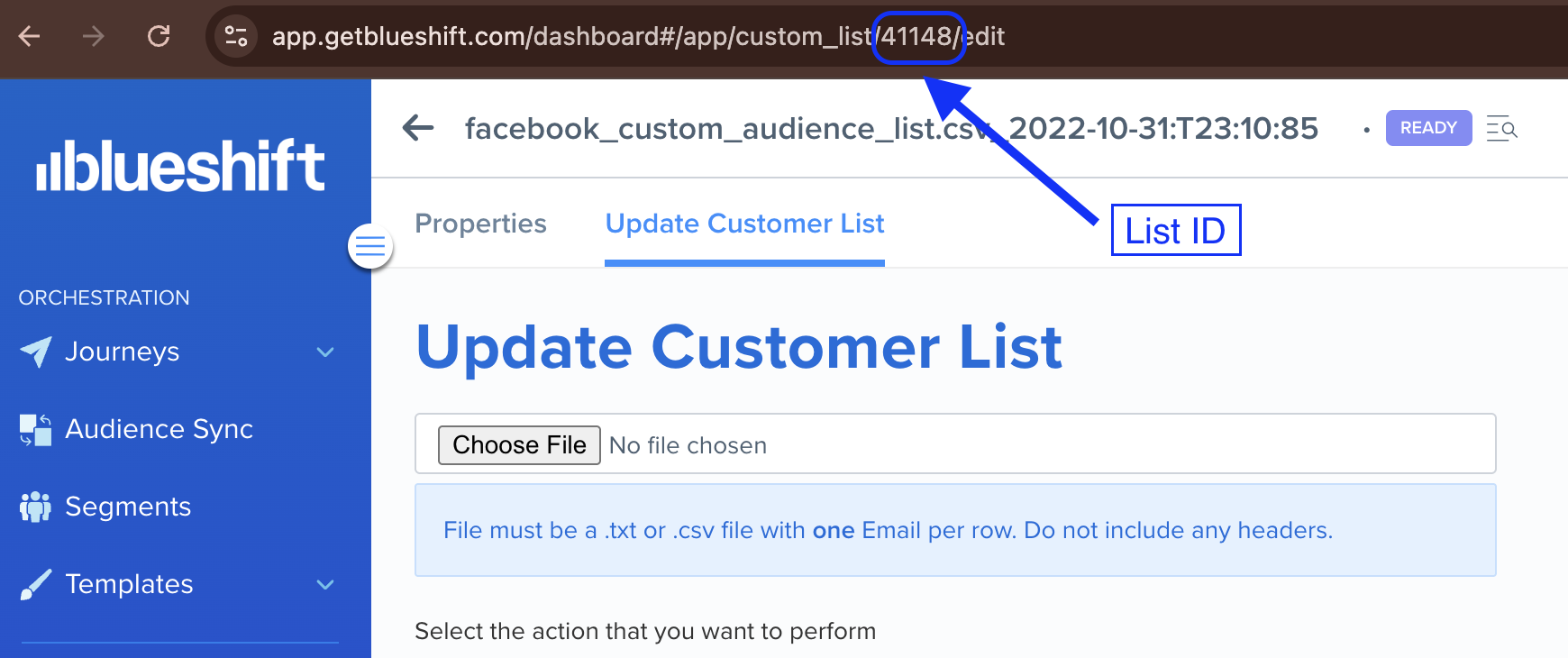 - List ID required: Obtain the list ID from the Create empty list response or from the Blueshift dashboard.